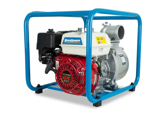 Our Bushranger pumps represent reliability, durability, and versatility. They are ideal for the transfer of large volumes of water. This WP301 Bushranger 3″ water transfer pump runs on petrol and is powered by a quality Honda GX200, 5.5 hp (4.1 kW) engine which features oil alert cut out. It has a maximum water flow of 916 litres per minute and has a total head of 30 metres.